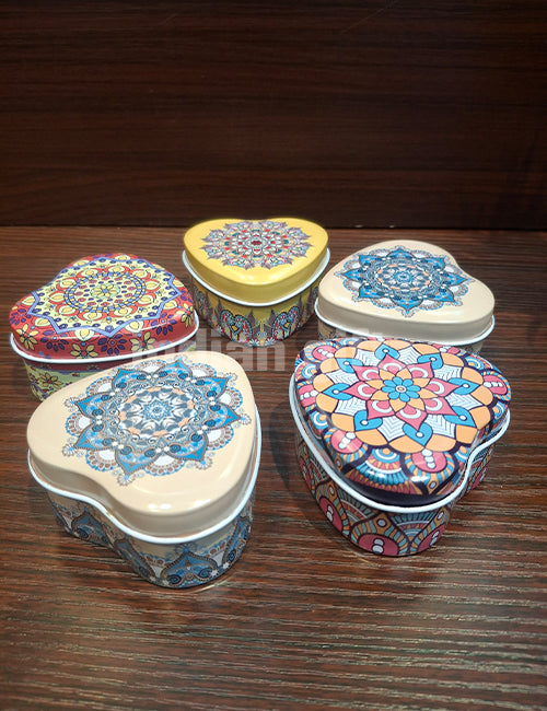 Stylish Heart Tin Containers Beautiful heart-shaped tins with lids in assorted traditional designsElegant Look Eye-catching mandala artwork adds a decorative touch to your space.Built to Last High-quality metal construction β sturdy, reusable & travel-friendly.Multi-Functional: Suitable for candle jars, spices, balms, chocolates, beads, rings, wedding favors & more.